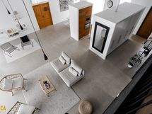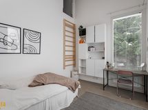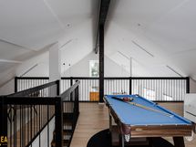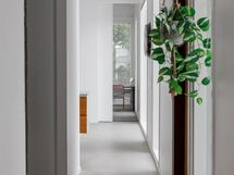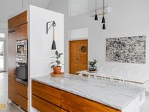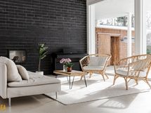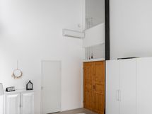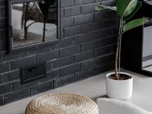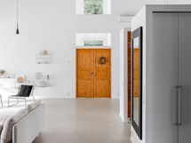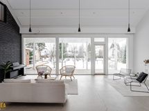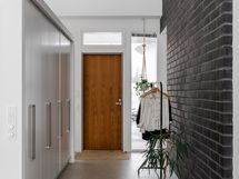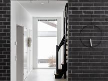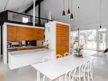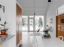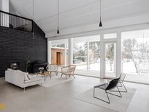 Kodin sydän on avara olohuone, jossa korkea huonekorkeus ja suuret ikkunat tuovat luonnonvalon kauniisti sisään. Tumma tiiliseinä luo tyylikkään kontrastin ja olohuoneesta on käynti länteen avautuvalle katetulle terassille – täydellinen paikka nauttia ilta-auringosta. Keittiössä yhdistyvät puun lämpö ja moderni linjakkuus ja laadukkaat materiaalit tekevät kokkailusta nautinnon.
