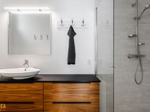 Saunaosasto on varustettu lämpöhaapapaneeleilla ja tervaleppälauteilla sekä heti valmis -sähkökiuas takaa pehmeät löylyt. Kodinhoitohuone on suunniteltu käytännöllisesti, silllä pyykinpesukone sekä kuivausrumpu on piilotettu tyylikkäästi liukuovien taakse.