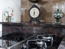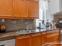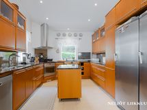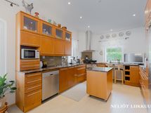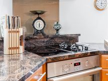 Keittiö on kokkaajan unelma: moderni ja hyvin varusteltu, sisältäen laadukkaat kodinkoneet kuten jääkaapin, pakastimen, astianpesukoneen, keraamisen liesitason, kaasulieden ja erillisuunin. Kauniit kivitasot ja käytännöllinen irrallinen saareke tekevät arjesta sujuvaa. Lattiat on laatoitettu, ja seinät ovat tyylikkään maalattu.