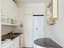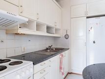 Jääkaappi, sähköliesi, liesituuletin, kaapistot, kiinteät valaisimet.