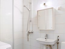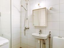 Kylpyhuone, suihkuseinä, peilikaappi, pesukoneliitäntä, kiinteät valaisimet.