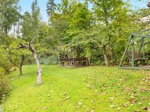 Taloyhtiöllä yhteinen piha-alue, jossa pöytä, pihakeinu, pyykkinarut ja omenapuita.