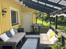 Tässä talossa on tilaa isommallekin perheelle tai vaikka yritystoiminnalle. Viiden makuuhuoneen lisäksi talossa on iso olohuone ja keittiö samassa tilassa, tilava eteinen, erillinen kodinhoitohuone, kylpyhuone ja sauna sekä toinen pienempi wc. Kaksi makuuhuonetta sijaitsee omassa rauhassa talon toisessa päädyssä, jonne on myös oma sisäänkäynti. Takapihalla on iso osittain katettu terassi, jossa voi ihastella auringonlaskua ja etupihan kuistille paistaa mukavasti aamuaurinko. Pihalta löytyy lisäksi kahden auton autotalli erillisellä varastotilalla, leikkimökki sekä saunamökki puusaunalla ja erillisellä tuvalla.