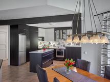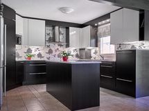 - Jääkaappi/pakastin, apk (uusittu 2023), höyryuuni, induktioliesi, mikro, liesituuletin hormiin, saareke, kvartsitasot