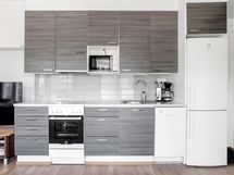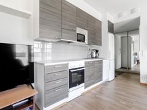 - Jääkaappipakastin, erillisuuni, keraaminen liesi, liesituuletin, kaapistot, kiinteät valaisimet.