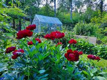 Pionipuutarha ja hirsimökki Hiidenveden tuntumassa