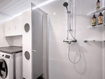 - Kylpyhuone/khh tila: suihku, suihkuseinä, pesukoneliitäntä, lattialämmitys, kaapistot, työtaso. Sauna: sähkökiuas. 2x erill. wc: wc-istuin, allaslaatikostot, yläkerta peilikaappi, alakerta peili.