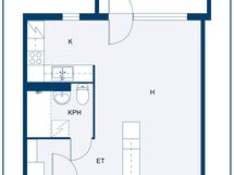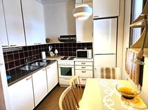 - Keittiön varusteet: Jääkaappipakastin, liesi ja liesituuletin. Liesi: Sähköhella. Työtason materiaali: Laminaatti.