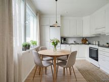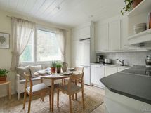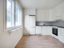 - Keittiön varusteet: Jääkaappipakastin, liesi, liesituuletin ja astianpesukone. Liesi: Keraaminen liesi. Työtason materiaali: Laminaatti.