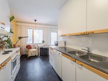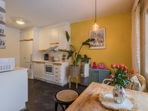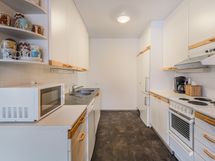 - Keittiön varusteet: Jääkaappipakastin, liesi, astianpesukone ja liesituuletin (hormiin). Liesi: Valurautaliesi. Työtason materiaali: Laminaatti ja terästaso.