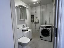 - Suihku, Lattialämmitys, Laattaseinä, Laattalattia, Allaskaappi, Peilikaappi, Kuivaava pesukone