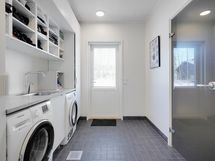 Kodinhoitohuone: pesukoneliitäntä, lattialämmitys, lattiakaivo, uloskäynti, pesuallas, pöytätaso, pyykkikaapit