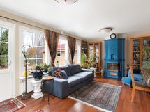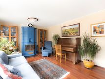 Tilavassa olohuoneessa on Kerman Saven varaava takka. Muutoin talo lämpiää poistoilmanlämpöpumpulla, joka onkin uusittu 2025. Yläkerrassa ilmanlämpöpumppu, jonka teho riittää kesällä viilentämään koko talon.