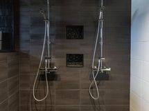 - Pesutilojen varusteet: Lattialämmitys. Pesutilojen kuvaus: 2 x kromatut sadesuihkut + perussuihkut (Oras). Seinässä kiinteä teline pesuaineille. Väliovi lasia + alumiinikahva kodinhoitohuoneeseen. Katossa paneeli, jossa Led- spotit. Erillisten WC:n lukumäärä: 2. Erillisen WC:n varusteet: WC-istuin, lattialämmitys, peilikaappi, allaskaappi ja bidee-suihku. Erillisen WC:n kuvaus: WC (oh): Peilikaappi Led- valolla + allaskaappi ja taso koko tilan pituinen. Välitilassa mosaiikkitarralevyt. Tasossa upotettu neliskulmainen allas + hana (Oras).