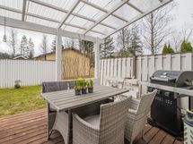 - Terassi noin 20 m2, terassilaudat uusitu 2017, katos/valokate tehty 2021, nurmipihaa, istutuksia: perennoja, oreganoa