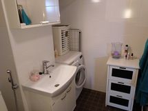 - Pesutilojen varusteet: WC-istuin, suihku, suihkuseinä, pesukoneliitäntä ja pesuallas. Pesutilojen kuvaus: -Suihku, suihkuseinä, wc, käsienpesuallas, pk-liitäntä