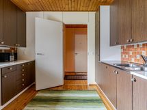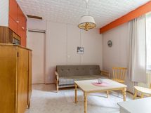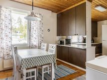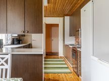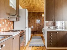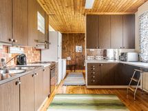 - Jääkaappi, sähköliesi 60 cm, liesituuletin hormiin liitetty, kaapistot, kiinteät valaisimet, pöytätasojen materiaali laminaatti.