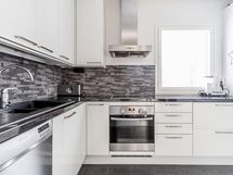 - Jääkaappipakastin, erillisuuni, liesitaso, induktioliesi, liesituuletin, astianpesukone, kaapistot, kiinteät valaisimet, kivitasot.