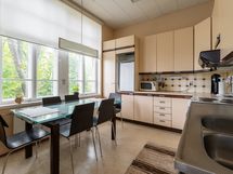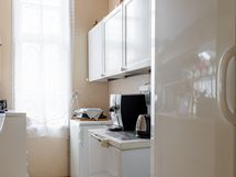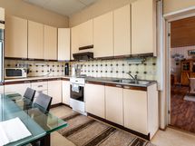 Liesi: sähköliesi. Työtasot: laminaatti. Kylmäsäilytys: jääkaappi, pakastin. Varustus: liesituuletin.