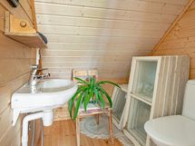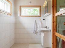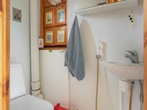 Alakerran wc:ssa on tuuletusikkuna, lämpöpatteri lattialämmityksen lisäksi sekä peili ja allaskaapisto.