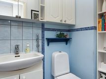 - Kellarikerroksessa pesuhuone: suihku, vesipata, lattia ja seinät laatoitettu, lattialämmitys, pesukoneliitäntä, taso- ja kaappitilaa. WC: Allas, allaskaappi, peilikaappi, WC-istuin, seinäkaappi.