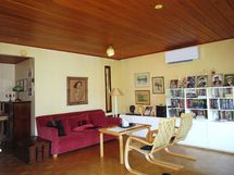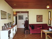 Olohuoneessa moasiikkiparketti ja makuuhuoneissa Pergo-laminaatti.