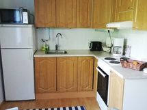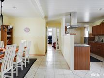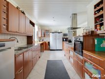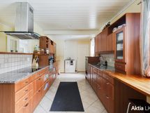 Kodin sydämessä on iso avara keittiö ja ruokailutilaa, johon mahtuu reilun kokoinen ruokailuryhmä. Puuhella antaa mukavasti lämpöä tilaan. Keittiöstä myös kulku suojatulle lasiverannalle ja takapihan terassille.