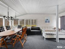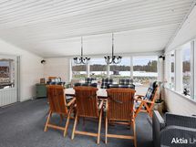 Olohuone on valoisaa ja siitä voi katsoa suoraan merelle. Olohuoneessa myös varaava takka ja kulku terassille.