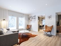 Huoneisto on valoisa ja päivän valoa tulvii huoneistoon tehden sen värimaailmalle onnistuneen ja viihtyisän tunnelman.