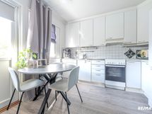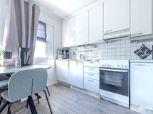 - Keittiön varusteet: Jääkaappipakastin, liesi, liesituuletin ja astianpesukone. Liesi: Keraaminen liesi. Työtason materiaali: Laminaatti.