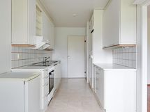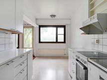 - Valkoinen kaapisto, jääkaappi, pakastekaappi, keraaminen liesi, liesituuletin, astianpesukone