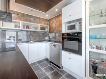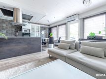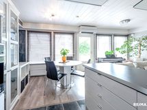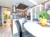 - Keittiön varusteet: Jääkaappi, erillinen pakastin, liesituuletin, erillisuuni ja astianpesukone. Liesi: Induktioliesi. Työtason materiaali: Laminaatti.