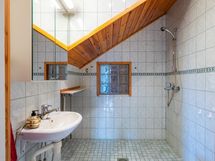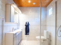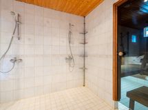 - Pesutilojen kuvaus: Saunaosaston tilava kylpyhuone on varustettu kahdella suihkulla, lisäksi varusteina on wc-istuin, peilikaappi, suihkuseinä, pesuallas ja allaskaapisto, sekä lattialämmitys. Kaakelisaumat on korjatttu, sekä wc-istuin vaihdettu 2025. Erillisen WC:n varusteet: WC-istuin, suihku, pesukoneliitäntä, pesuallas, bidee-suihku ja peilikaappi. Erillisen WC:n kuvaus: Alakerran wc:n varustina on pesuallas, wc-istuin, peilikaappi, suihku, pesukoneliitäntä, laatta, kaakeli. Bidé. Mikäli tätä tilaa halutaan käyttää kylpyhuoneena, se edellyttää tilan saneeraamista tai suihkukaapin asentamista.