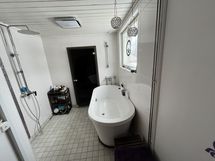 - Tähän on listattu päätalon kylpyhuoneen tiedot: Suihku, Useita suihkuja, Kylpyamme, Pesukone, Kuivausrumpu, Laattalattia, Laattaseinä, Avattava ikkuna, Lattialämmitys