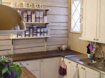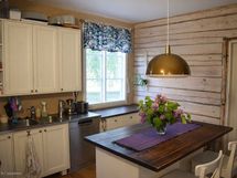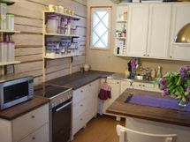 - Täysipuinen mittatilauskeittiö, työtasot lehtikuusta, kulmakaapissa Le Mans-mekanismi. Iso teräksinen tiskipöytä kahdella altaalla. Teräksiset kodinkoneet (astianpesukone, keraaminen liesi ja side-by-side jääkaappi-pakastin). Keittiössä myös puuhella, joka tällä hetkellä käyttökiellossa.