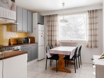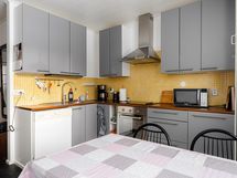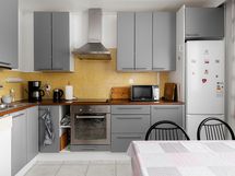 - Jääkaappipakastin, erillisuuni, keraaminen liesi, liesituuletin, astianpesukone, kaapistot, kiinteät valaisimet.