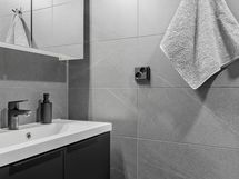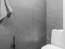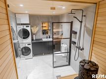 - Pesutilojen kuvaus: Suihku, suihkuseinä, pesukone, kuivausrumpu, pesukonliitäntä, lattialämmitys, peili, pesuallas ja allaskaappi. Lattia laattaa ja seinät kaakeloitu. Erillisten WC:n lukumäärä: 1. Erillisen WC:n kuvaus: Wc:n lattia on laattaa, seinät kaakeloitu. Wc-istuin, lattialämmitys, peilikaappi, pesuallas, allaskaappi, bidee-suihku ja lattiakaivo.