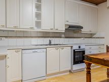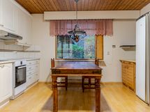 Keittiö on uusittu 2000-luvun vaihteessa. Vaaleat kaapistot ja tasot. Keittiössä on lattiat parkettia, katto puupaneelointi ja seinät laatattuja. Keittiössä on jääkaappi, pakastinkaappi, sähköliesi, liesituuletin ja astianpesukone. Siistikuntoinen keittiö.