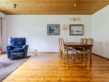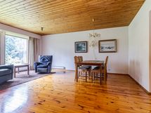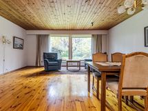 Suurikokoinen olohuone, jossa on isot ikkunat. Ikkunat on uusittu 2000-luvun alussa. Huoneessa on lautalattia ja paneelikatto.