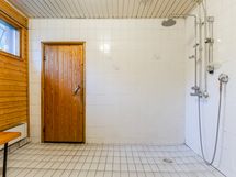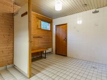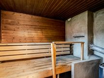 Kuvaus: Iso puukiukaalla varustettu löylyhuone. Pintamateriaalit ovat käyttökuntoisia, mutta vanhoja.