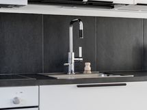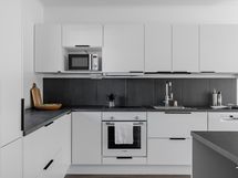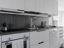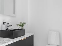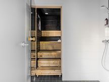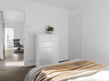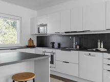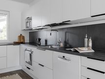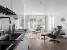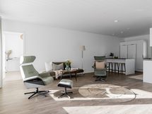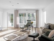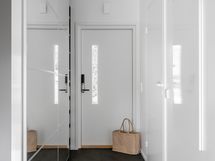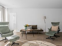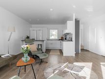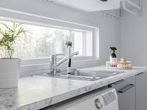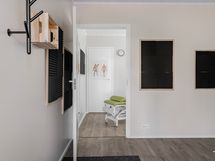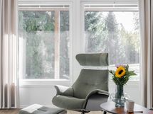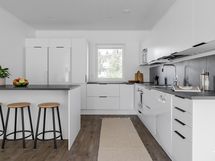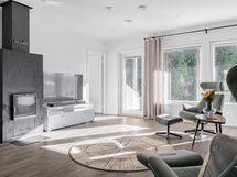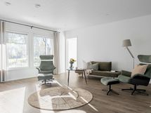 Sisustuksessa on panostettu ajattomuuteen ja laatuun: kestävät ja tyylikkäät laminaattilattiat (KL32) sekä harmoninen värimaailma luovat pohjan monenlaiseen sisustustyyliin.