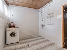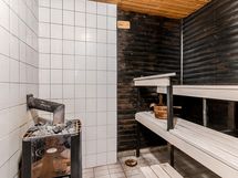- Iso löylyhuone, jossa paneeloinnit, lauteet ja puukiuas. Lattiamateriaali: laattalattia