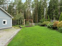 Pihapiirissä on myös lapsille suunniteltu leikkialue, jossa on keinut, jousikeinu, hiekkalaatikko ja rekkitangot sekä tilaa trampoliinille. Turvallisuus on huomioitu kokonaisuudessa.