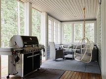 Olohuoneesta on käynti suurelle katetulle terassille ja edelleen piha-alueelle, jossa sijaitsee uima-allas vastavirtalaitteella, hierovalla suihkulla ja energiatehokkaalla lämmitysjärjestelmällä.