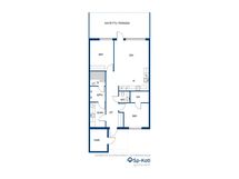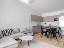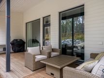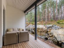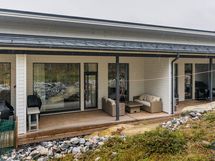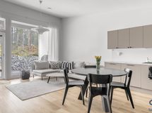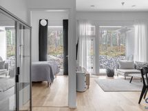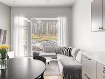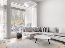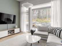 Tämän upean asunnon kaikki asuintilat ovat käytännöllisesti yhdessä tasossa. Olohuone ja avokeittiö muodostavat modernin ja näyttävän tilan, jonka avaruutta korostaa korkea huonekorkeus. Lisäksi valtavasta takaseinän ikkunasta tulvii luonnonvaloa, mikä tekee kodista erittäin valoisan. Olohuoneesta on myös kulku takapihan katetulle terassille, josta avautuu erittäin viihtyisä ja suojaisa metsämaisema. Makuuhuoneet on sijoitettu eri puolille asuntoa, mikä tuo rauhaa ja