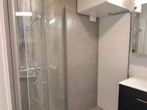 - Peilikaappi, allaskaappi, rättipatteri, Suihkuseinä, pesukoneliitäntä, laattalattia, laattaseinä, lattialämmitys