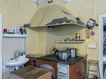 Kaapistot, puuhella, liesikupu, jääkaappi/pakastin, sähköliesi
