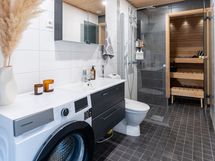 - Varustus: suihkuseinä, pesukoneliitäntä, lattialämmitys, wc-istuin, suihku, peilikaappi, kiinteät valaisimet, kylpyhuonekaapisto.