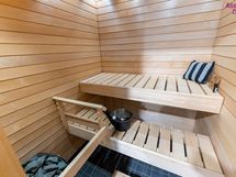 - Kuvaus: Saunan lattia laatoitettu ja seinä paneloitu. sähkökiuas