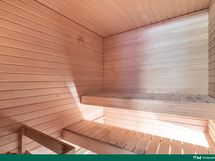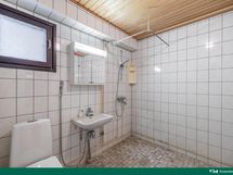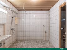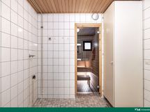 - Kaakeloitu kylpyhuone: suihku, allaskaappi, peilikaappi, wc, pk-liitäntä, bidee. Sauna: paneloitu, sähkökiuas.